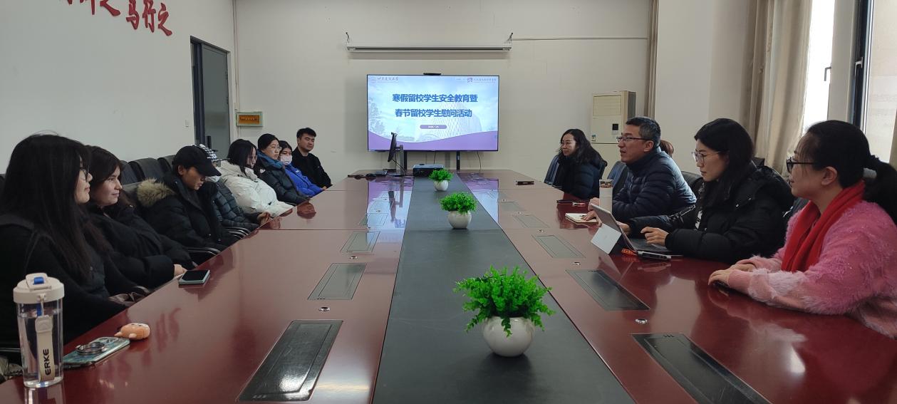 会上,陈晨和王一茜围绕安全提示、学业规划以及健康生活等多个方面,向学生们提出了具体建议和明确要求,强调了个人安全防范意识的重要性,并鼓励大家科学制定学习目标、保持规律作息。随后,孙冬梅和王丹代表银河娱乐app 向春节期间选择留校的学生们表达了诚挚的关心和亲切的问候,细致询问每一位同学寒假的学习安排与日常生活需求,并温馨提醒大家要合理规划假期时间,做到劳逸结合,度过一个充实而愉快的春节。