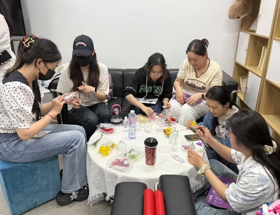 同学们领取花材、矿物油、花瓶等材料,在纸上设计构图后,将花材分层放入花瓶并注入矿物油。最后,将写有快乐或心愿的纸条装入胶囊放入花瓶,系上丝带完成装饰。通过这一过程,同学们不仅发挥创意,还把快乐和积极情绪永久保存,为未来留下美好回忆。