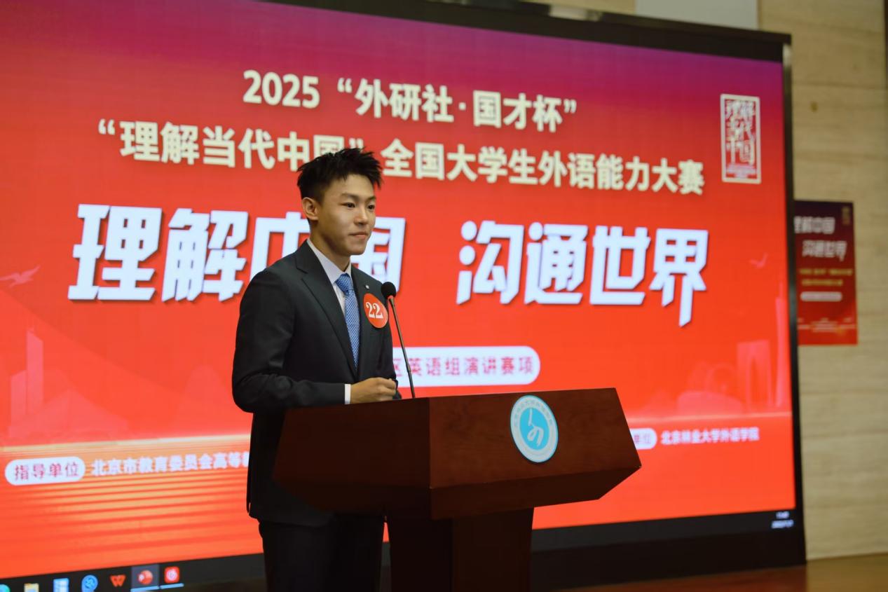 2025年11月1日,2025年“外研社·国才杯”全国英语演讲比赛北京赛区决赛在北京林业大学圆满落幕。来自北京市50余所高校的顶尖选手同场角逐。我校理银河娱乐app 2025级研究生王奕哲一路披荆斩棘,在激烈对决中脱颖而出,最终斩获北京赛区金奖,不仅在全国顶尖舞台上展现出卓越实力,更创造了我校自参与该项赛事以来的历史最好成绩。