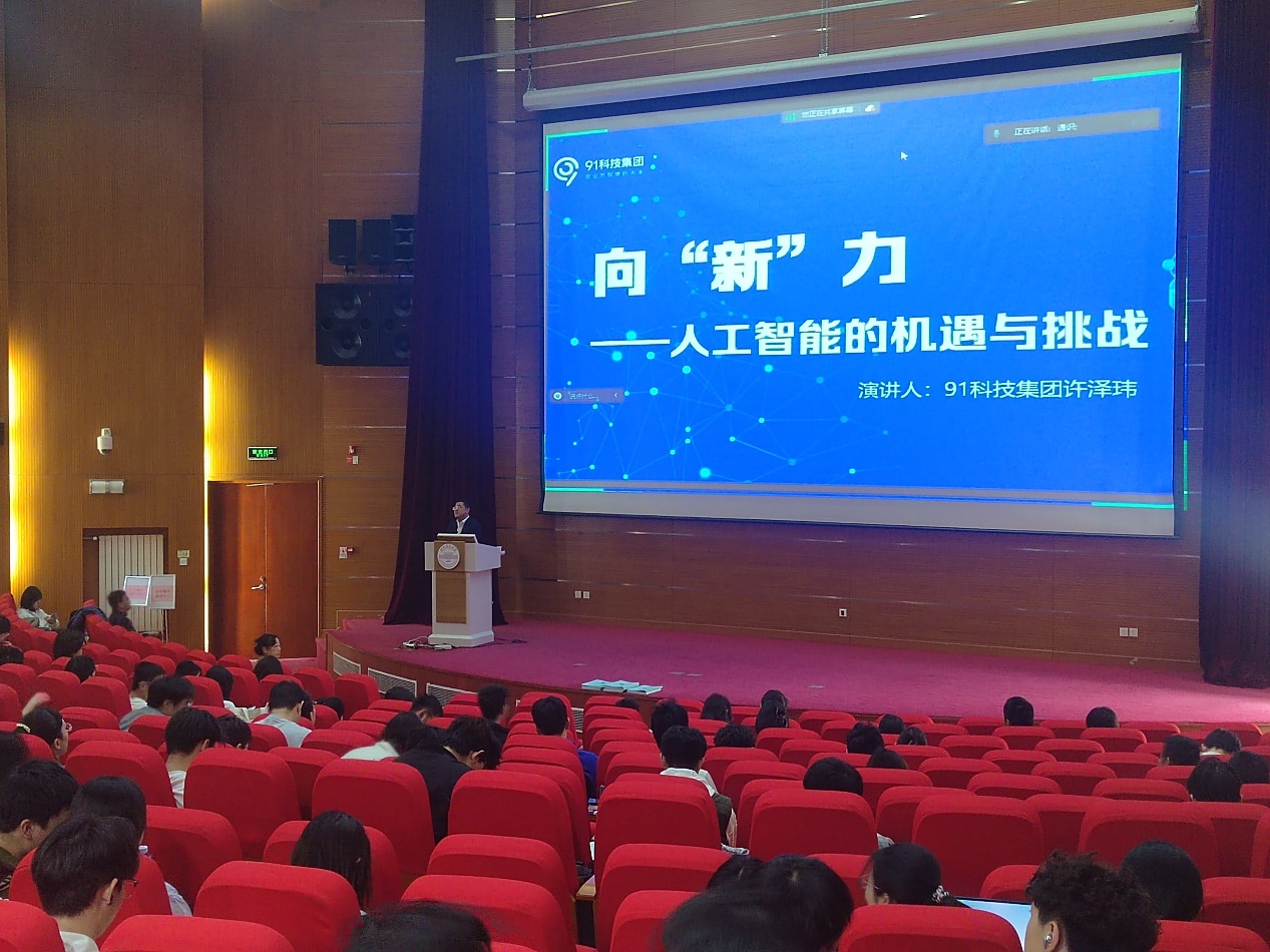 讲座伊始,许泽玮先生结合自身创业经历,讲述了人工智能从概念到现实的发展历程,分析了其主要类型(如机器学习、深度学习等)及在金融服务、智能制造、医疗保健等多个领域的应用。他结合91科技集团的实践,展示了AI在提升企业效率、优化决策和战略赋能方面的巨大潜力。例如,“91金融小助手”为中小微企业提供智能化融资方案、AI辅助法律服务等创新应用。此外,许泽玮分析了全球人工智能的中美“双雄”格局,以及中国在政策支持、智能算力、专利申请量等方面的发展优势,但同时也面临核心技术突破、伦理规范、政策监管等挑战。他还特别提到了人工智能对就业结构的影响。