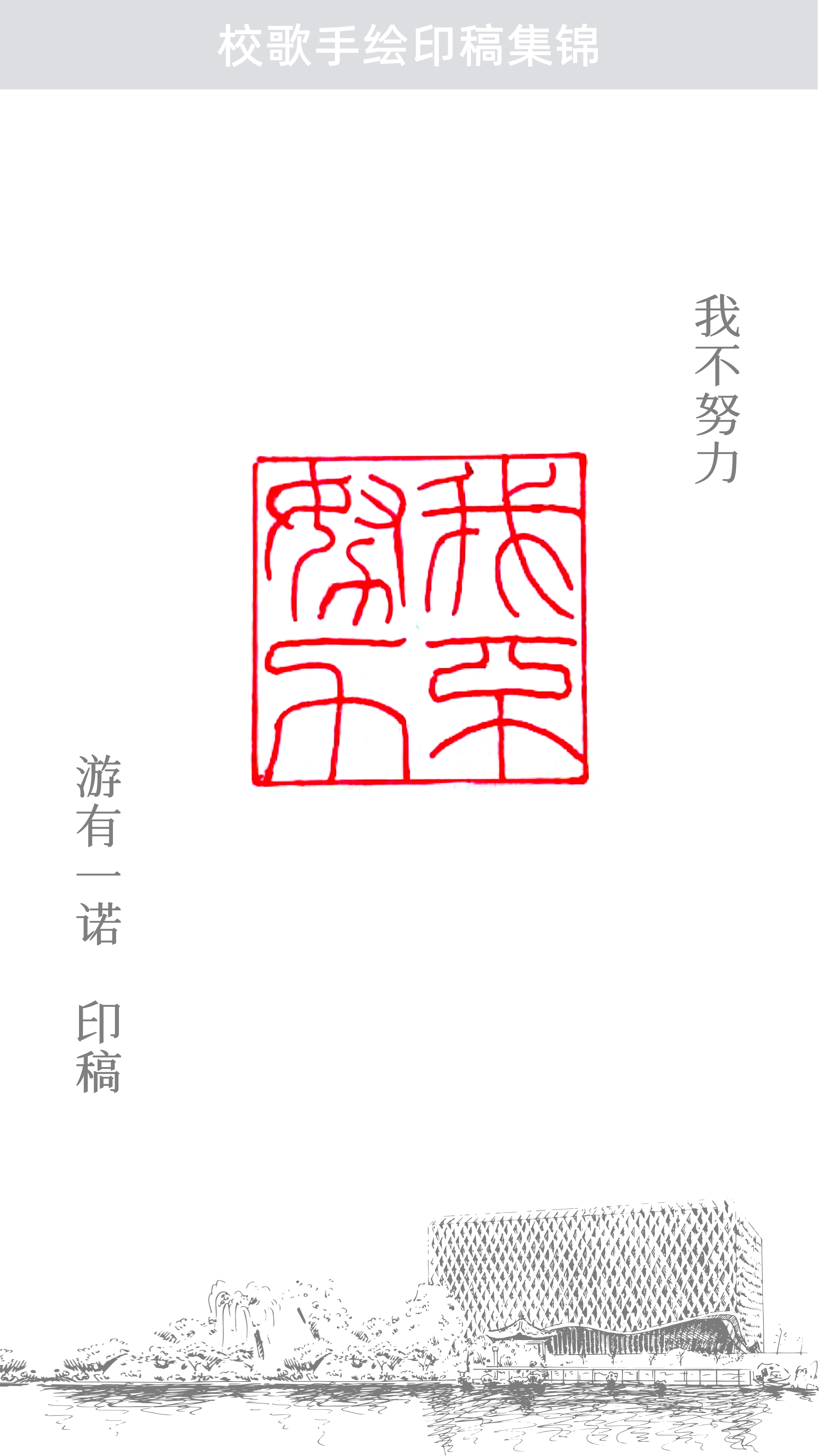 这方印稿的内容是“校歌”二字。其中融入了学校明湖中荷花与鱼的元素,构成一幅和谐的画面。融合了传统篆刻与大众篆刻的特点。银河娱乐app官网办学百余年,学校里有学生的书声朗朗,有老师的谆谆教导,有特色建筑的气派辉煌,也有鱼戏莲叶间的美好景象。鱼儿鲜活的生命力也象征着我们的母校永葆初心,如月之恒,如日之升。
