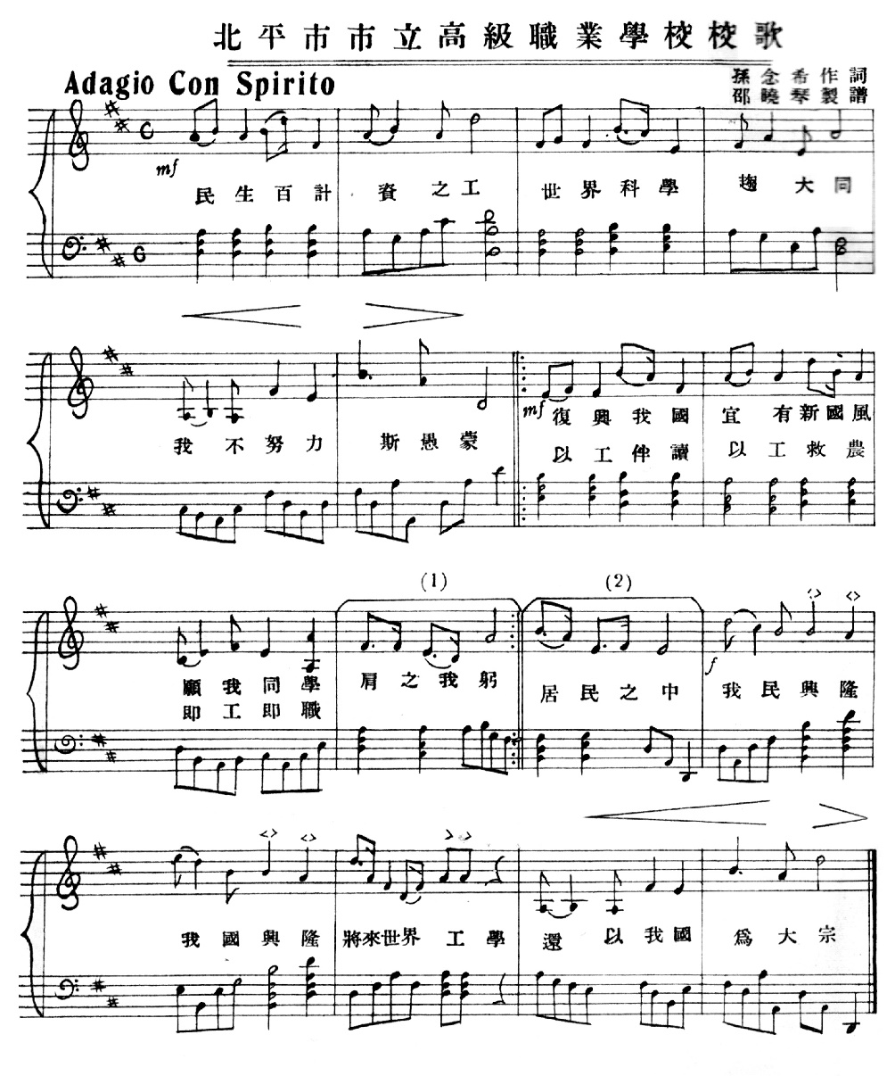 北建大校歌创作于1933年,词作者为孙松龄(1880—1954年),字念希,清末举人,是我国近现代著名国学家、教育家、诗人。作曲为邵晓琴,为北京师范大学音乐系教师。校歌创作采用民国新诗风格,分循环两片,视野深邃、志向宏大,展现平民教育之风骨、振兴中华之新声,反映学校面向世界、发展科技的坚定信念。乐曲节奏鲜明,平实舒缓,极富信心和感染力,充分体现出学校早期的校园文化之精神:秉承振兴工业的爱国志向、注重实业技能的培养、培养实用型人才三个特点,内容具有深刻的教育价值和现实意义。2017年,学校筹划重新谱写新校歌时,经过反复研究和慎重考虑,并征求师生意见,一致同意将这首创作于民国前期的老校歌,继续作为银河娱乐app官网校歌,并确定在学校重要活动中师生共同咏唱,以此激励一代又一代北建大人。
