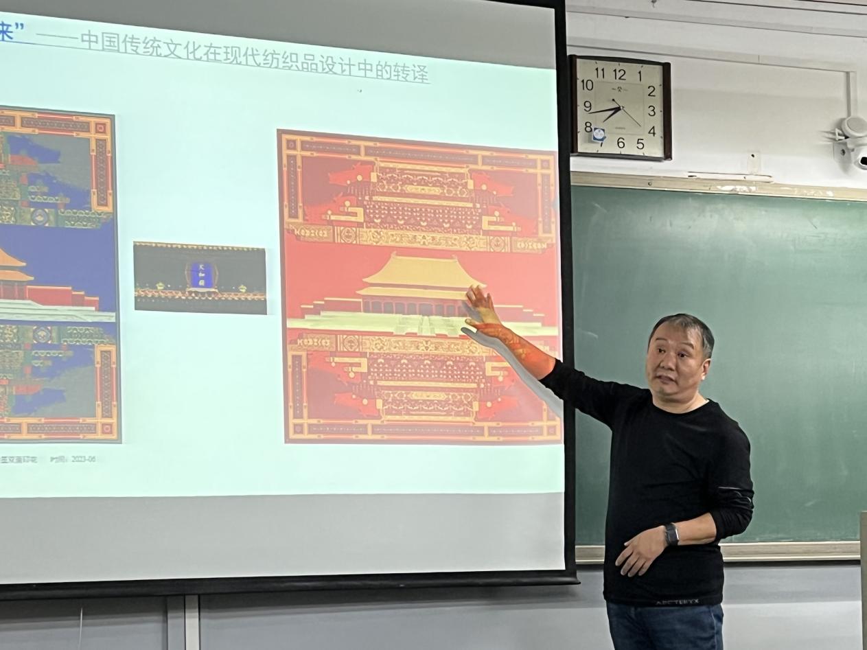 张教授介绍了艺术设计与文化传播的关系,指出设计师具有桥梁的作用,连接过去和未来,通过艺术创作为明天服务。针对如何把传统文化与现代设计相结合,他强调设计不是被动的复制,而是由一种表现形式向另一种表现形式的创造性转换。他以纹样插画等艺术作品与设计结合的商业价值转换为例,指出中国绵长深远的传统文化是智慧的、流动的、活态的,可以为现代设计提供取之不尽、用之不竭的灵感与启示。将中国传统造物理念进行现代化转译和跨文化解读,实践于当代纺织艺术设计之中,为中国设计带来别有洞天的景象。通过文化与经济的结合,将传统文化转化为效益,可以进一步推动中华优秀传统文化创造性转化、创新性发展。