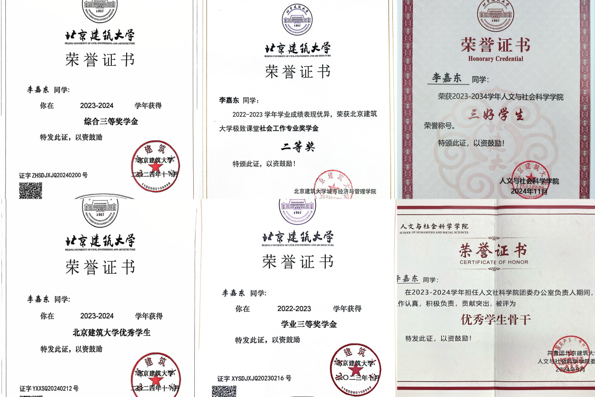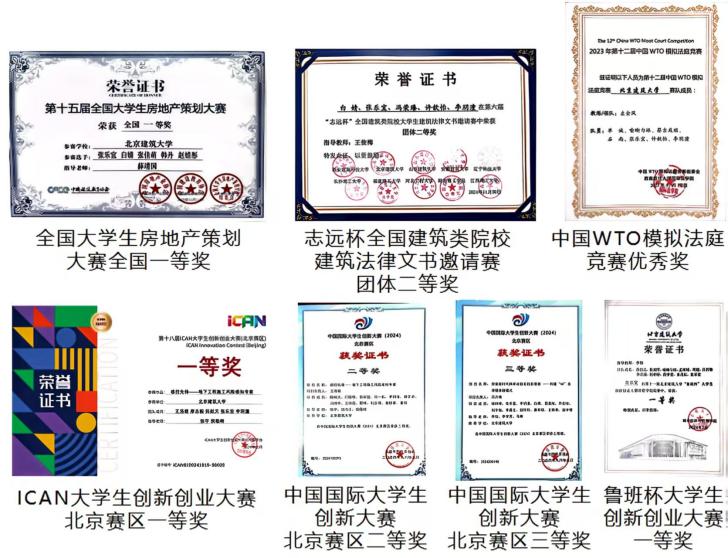 张乐宜将所学专业知识与其他专业知识融入国、市、校等各类比赛中,学以致用,学以贯通。曾获全国大学生房地产策划大赛全国一等奖、“志远杯”全国建筑类院校建筑法律文书邀请赛二等奖等三项国家级奖项,2024中国国际大学生创新大赛北京赛区二等奖、ICAN大学生创新创业大赛北京赛区一等奖等五项省部级奖项,以及鲁班杯一等奖等十余项院校级奖项。