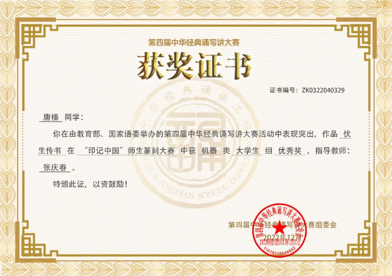 雅言传承文明,经典浸润人生。日前,由文发院指导推送的社192班顾丹玉等5名同学的篆刻作品、城181班刘琼临等9名同学的书法作品,分别参加了第四届中华经典诵写讲大赛“印记中国”师生篆刻大赛、“笔墨中国”汉字书写大赛两个分赛项,在北京初赛与全国决赛中均取得优异成绩。