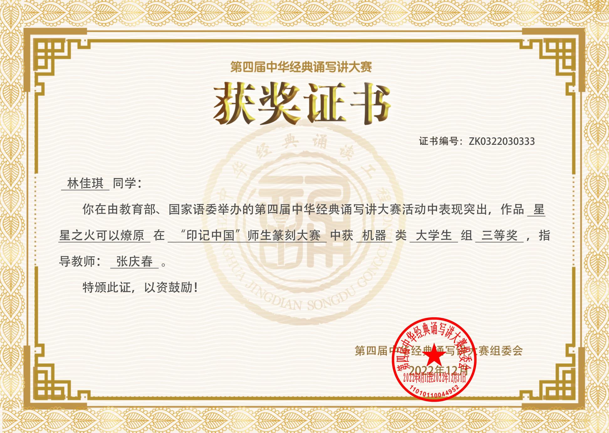 学校通识核心课《中国书法篆刻(工作坊)》主讲老师张庆春被评为北京初赛、全国决赛优秀指导教师奖。至此,张庆春老师已连续三届获得优秀指导教师奖项。2022年4月开赛报名后,他为适应新冠疫情防控形势专门组织了线上培训班,除统一讲解基础知识外,还针对每位参赛学生的具体情况制定了一生一策的个性化的指导方案,加强了作品创作实践中各个环节的指导力度,收到了良好的教育效果。