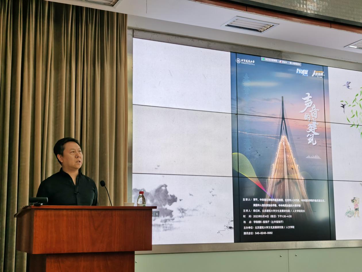常平教授认为,建筑和音乐一样需要精心设计整体结构与挑选合适材料。音乐编曲所涉及的平衡、动力、布局、风格以及时代和民族特色等概念,与建筑有着异曲同工之处。随后他从西方音乐史切入,向与会听众讲述了巴洛克主义、古典主义、浪漫主义、新古典主义以及现代主义等音乐流派的发展进程,并向学生分享自己创作交响乐的感受,从而引申出音乐教育的重要性。常平教授指出,走进音乐艺术的大门,可以为我们打开一个新的世界,好的音乐会荡涤人的灵魂,在高校通识教育中,音乐教育尤为重要。同时,音乐家要关注人类命运,关注科技发展与人类生活的关系。