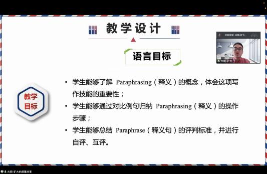 古明老师和林旭老师曾分别获得第十届“外教社杯”全国外语教师教学比赛视听说组和综合组北京市一等奖。在本次培训会中,两位老师先后从决赛流程、参赛体会、课程案例、备赛要点、说课形式及提问准备等几个方面作分享。古明老师运用思维导图详细阐述了说课环节的流程和重点;林旭老师着重分享了比赛的具体策略和注意事项,并针对课程思政、语言目标以及评委提问等方面提出了专业的建议。