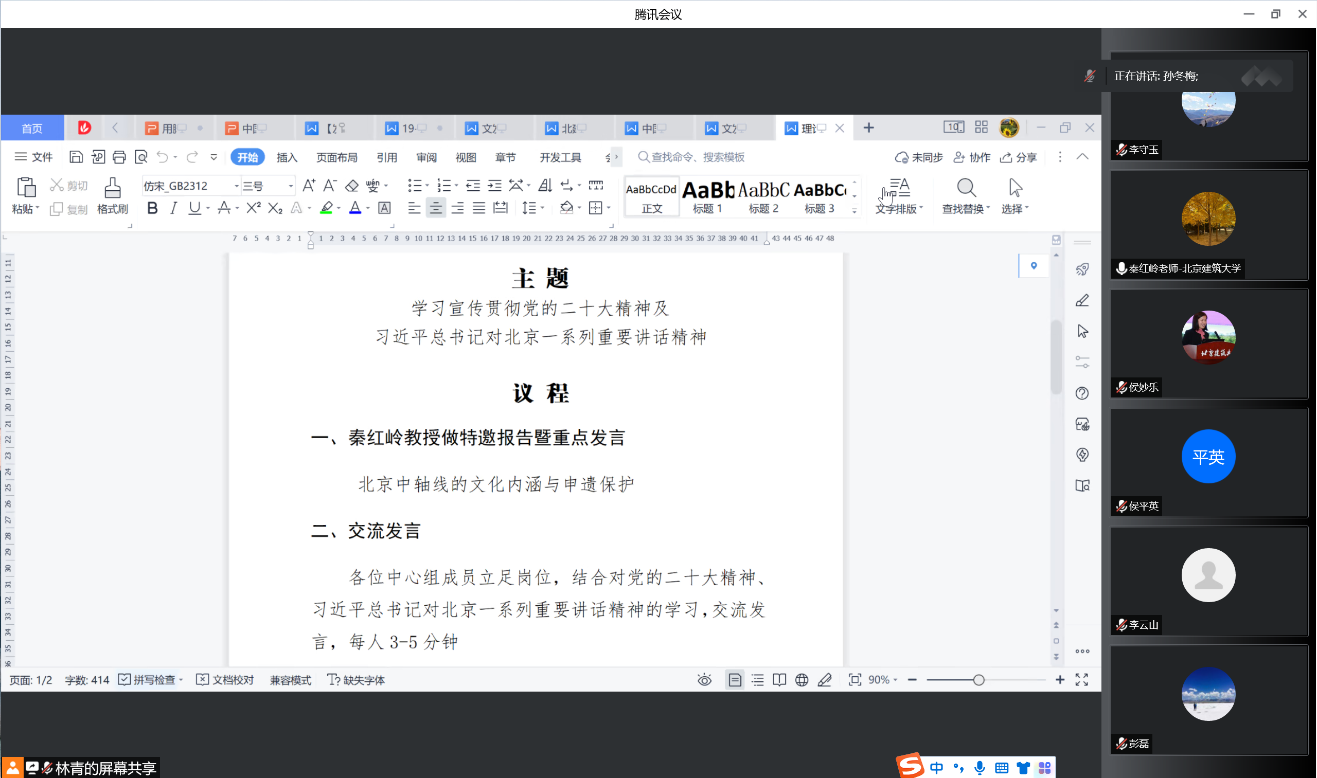 孙冬梅在总结中提出认真学习宣传贯彻党的二十大精神是当前和今后一个时期的首要政治任务,中心组成员在学习中要把握学什么和怎么学。一是要把学习习近平总书记关于北京的系列重要讲话和学习宣传党的二十大精神结合起来,二是坚持读原文、悟原理,准确认识把握习近平新时代中国特色社会主义思想的精神实质。三是坚持知行合一,作为有百年历史的建筑类高校的文发院/人文银河娱乐app 的班子成员和骨干教师,要在历史文化传承和保护中担当起应有的责任,切实做到“学思用贯通,知信行统一”。具体而言,一要继续推进人文学科建设的探索和人文教育的建设,建立具有工科特色的人文教育课程体系,以更好地发挥人文学科、人文教育在培养高质量“三师”人才方面的作用。二要充分利用文发院搭建的平台,组织校内外相关人员开展建筑文化和城市文化的研究,价值阐释、展示和传播工作,提升文发院/人文银河娱乐app 服务全国文化中心建设的能力,把打造服务北京文化发展的高端智库作为努力方向。
