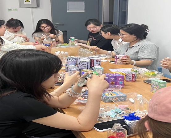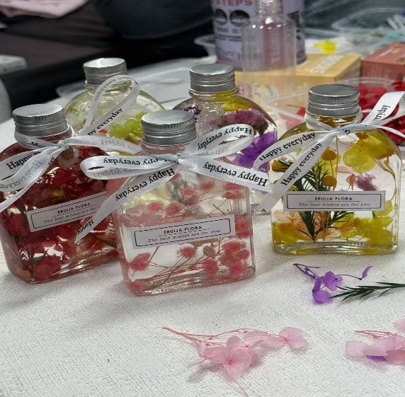 同学们领取花材、矿物油、花瓶等材料,在纸上设计构图后,将花材分层放入花瓶并注入矿物油。最后,将写有快乐或心愿的纸条装入胶囊放入花瓶,系上丝带完成装饰。通过这一过程,同学们不仅发挥创意,还把快乐和积极情绪永久保存,为未来留下美好回忆。